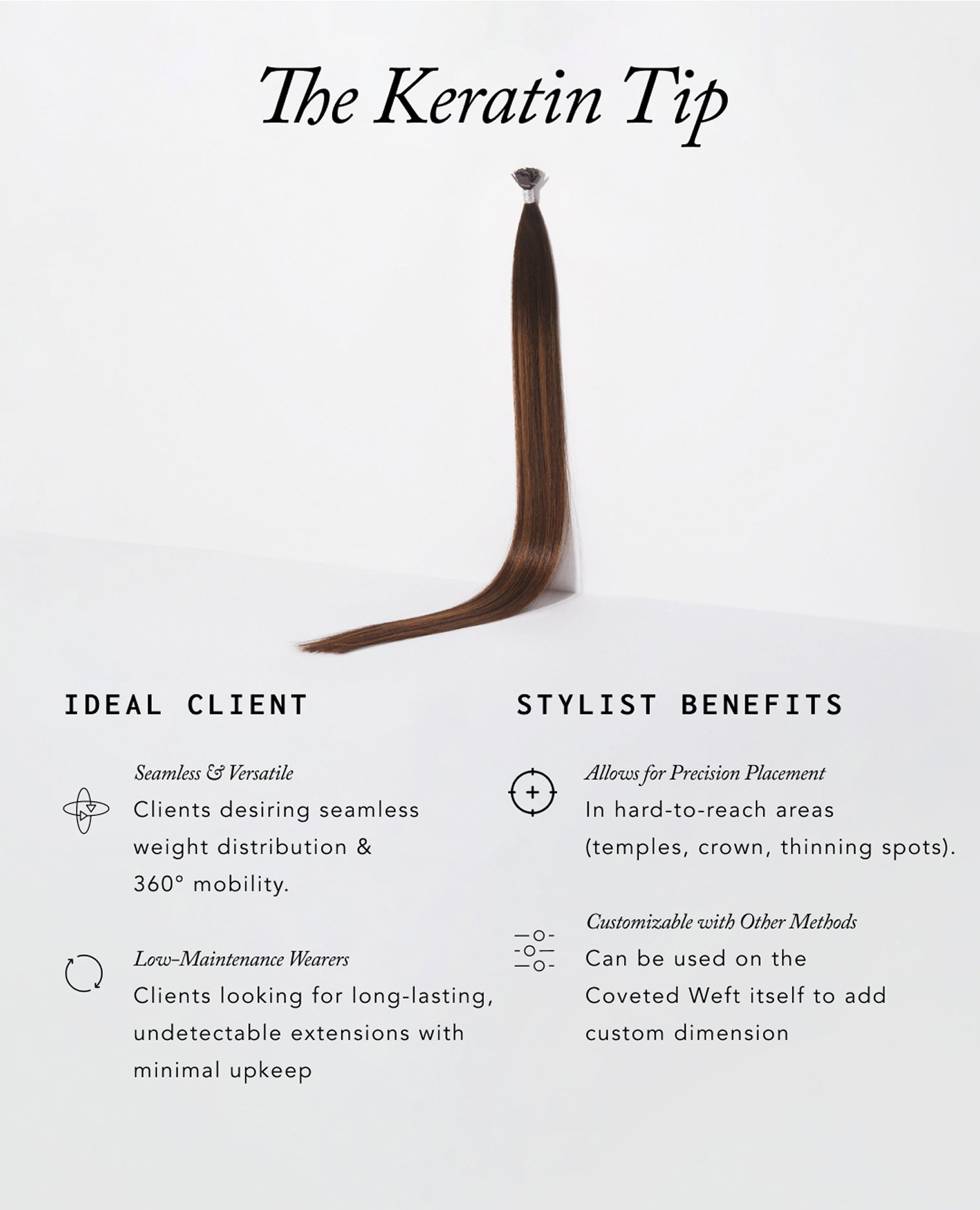 Because every client has different needs, The Keratin Tip works perfectly with The Coveted Weft and Cut-Point Weft for added volume & versatility.